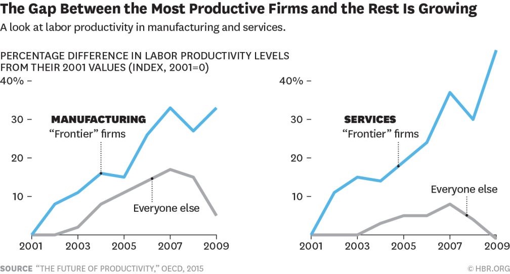 It started when I read this article,Productivity Is Soaring at Top Firms and Sluggish Everywhere Else on the Harvard Business Review site. The article has a terrific and terrifying graphic that shows the widening gap in productivity between firms that are innovating and their competitors.
